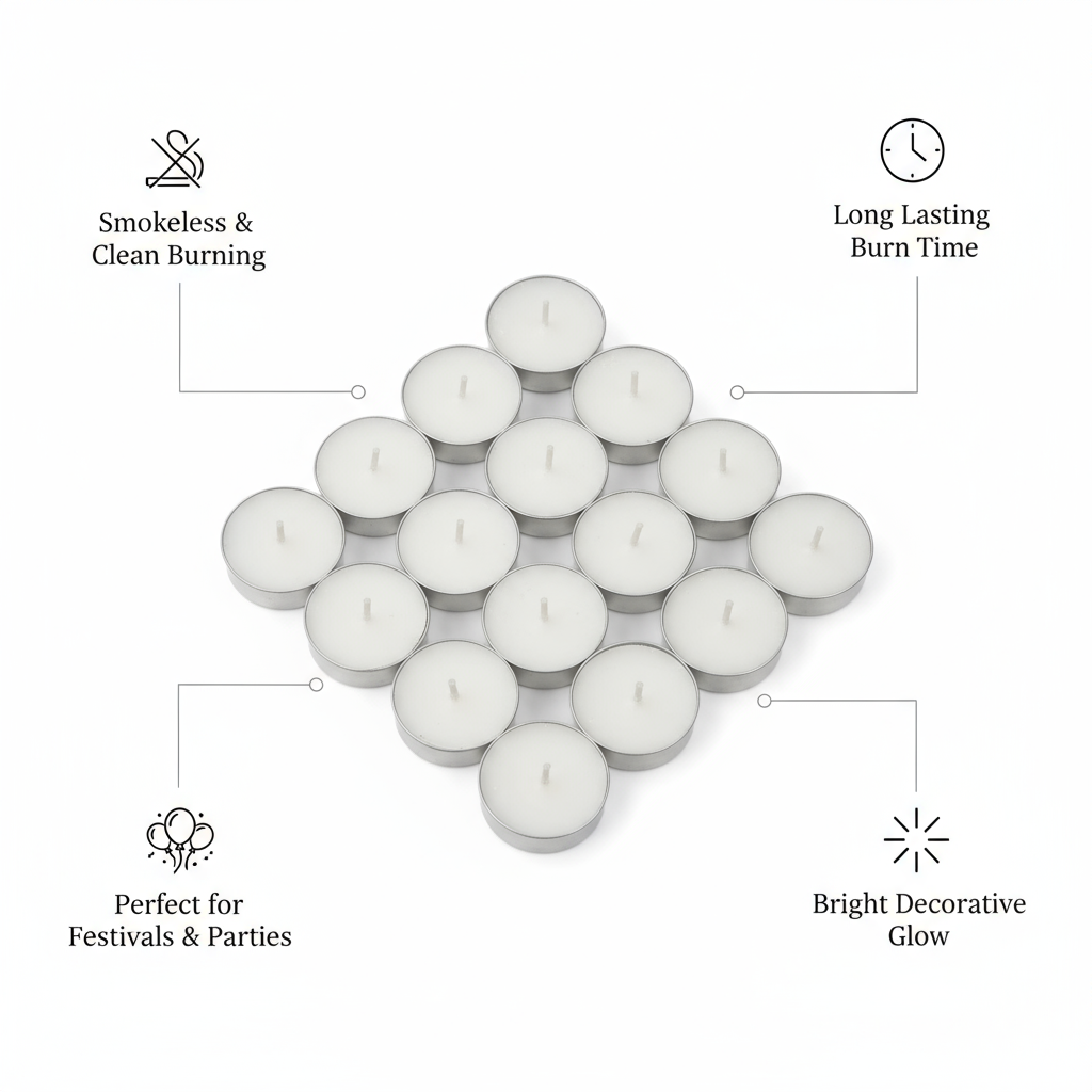 Ideal for pooja rituals, festive décor, weddings, or cozy dinners, each candle burns evenly for up to 3 hours, leaving your space calm and illuminated. Whether placed in candle holders, diya stands, or floating arrangements, these tealights add elegance to your celebrations and serenity to your everyday moments.