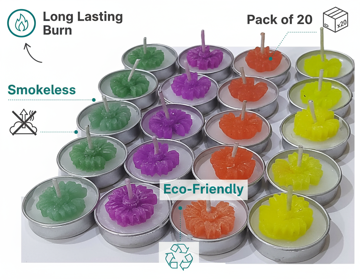 Perfect for Diwali, celebrations, or gifting, this set of 20 colorful tealight candles combines handcrafted artistry with lasting quality — spreading joy and light with every flame.